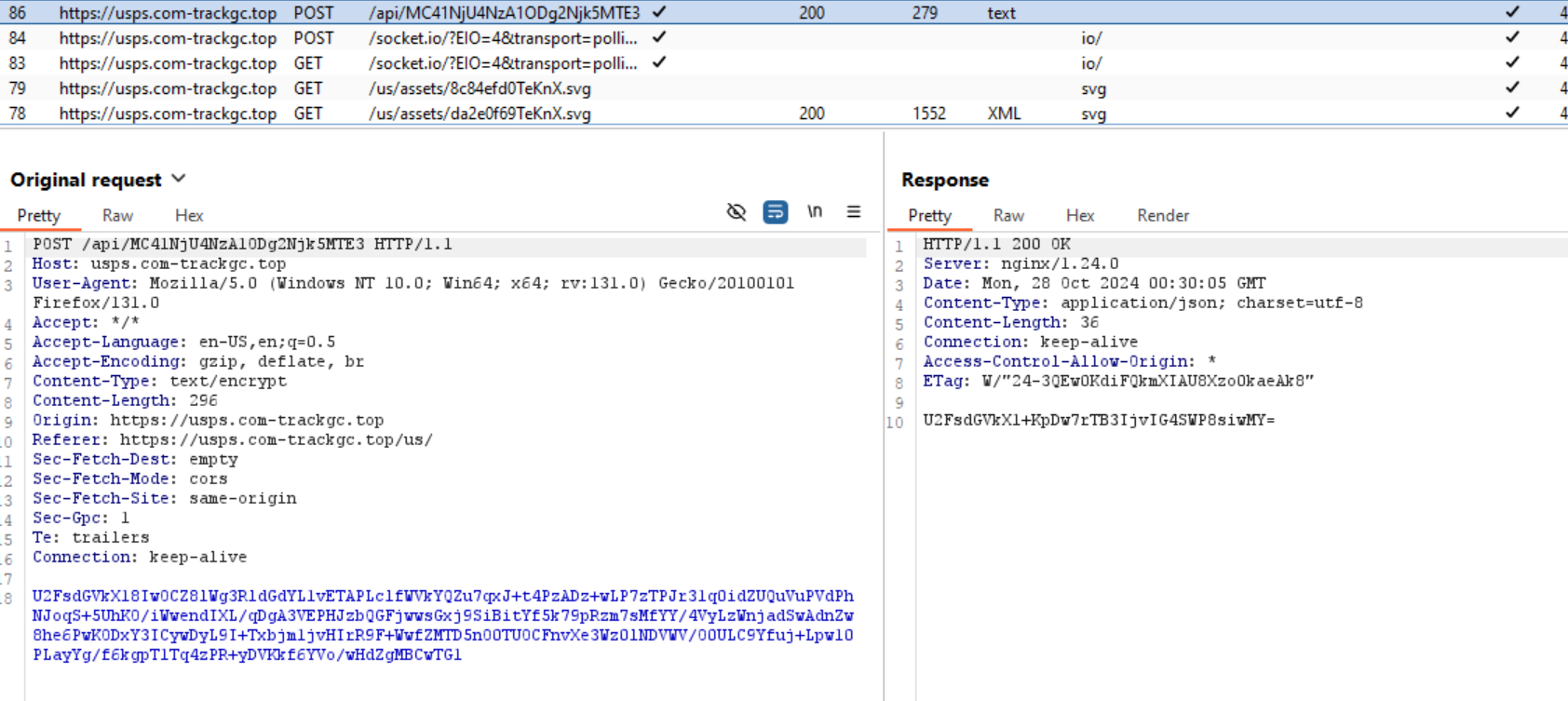 Just like with the previous USPS phishing campaign, I dove in and started looking for vulnerabilities in this kit. Starting off was looking at the traffic going to and from the web application.