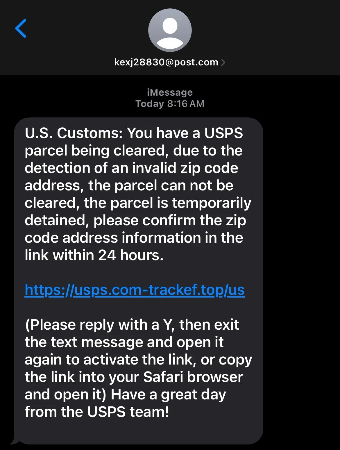 <figure><img src="https://1987229882-files.gitbook.io/~/files/v0/b/gitbook-x-prod.appspot.com/o/spaces%2FuSROL4SI6SkTn8EwsIii%2Fuploads%2Fn2f4ef27BJ1Rt1ti5SqG%2Fusps-scam-text-new.png?alt=media&#x26;token=b86802fd-48e0-4c26-a6cb-26faf6672cfb" alt="" width="375"><figcaption><p>New USPS Phishing Text</p></figcaption></figure>